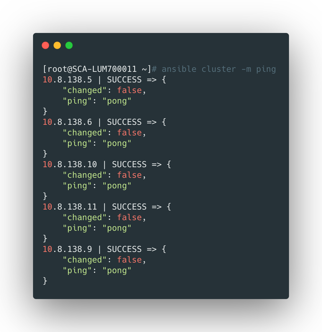 1 | ansible cluster -m shell -a 'cat >> /etc/hosts <<EOF |