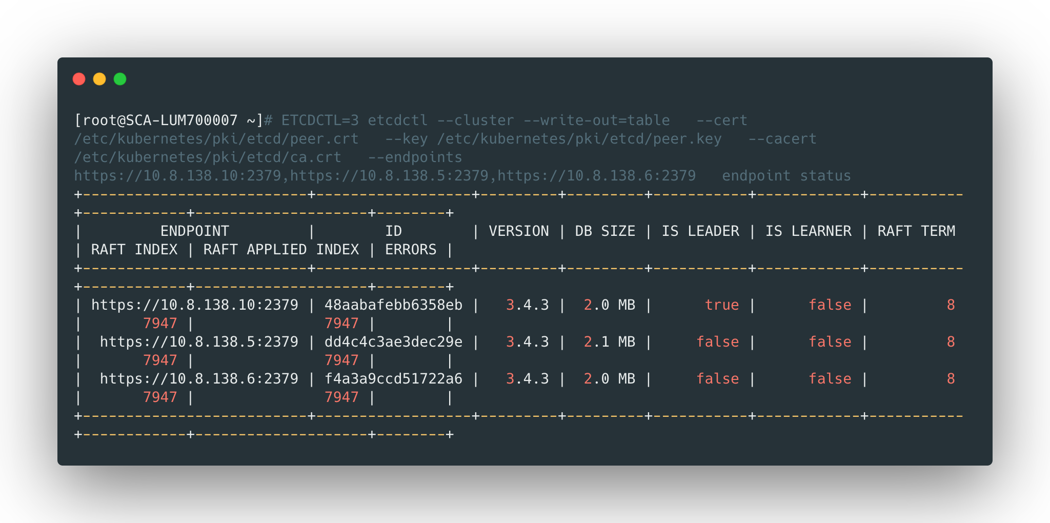 1 | ETCDCTL=3 etcdctl --cluster --write-out=table --cert /etc/kubernetes/pki/etcd/peer.crt --key /etc/kubernetes/pki/etcd/peer.key --cacert /etc/kubernetes/pki/etcd/ca.crt --endpoints https://10.8.138.10:2379,https://10.8.138.5:2379,https://10.8.138.6:2379 endpoint status |
