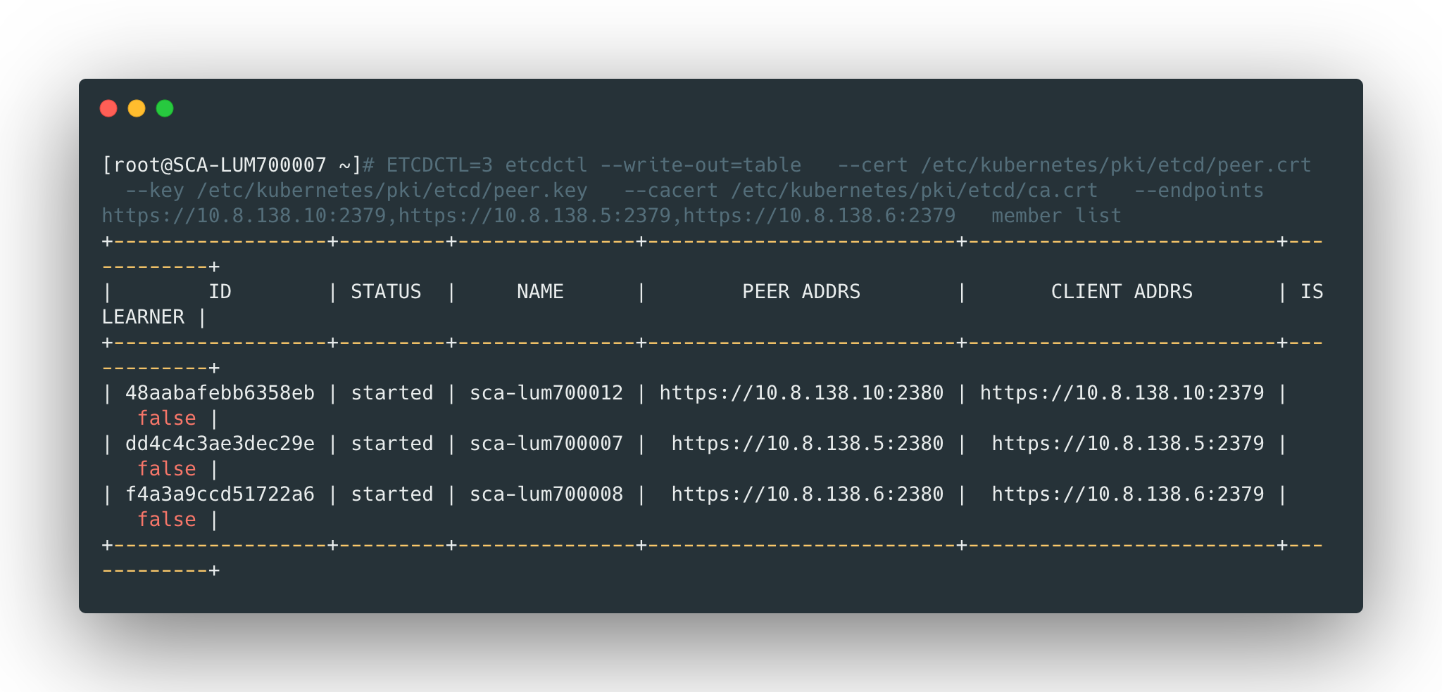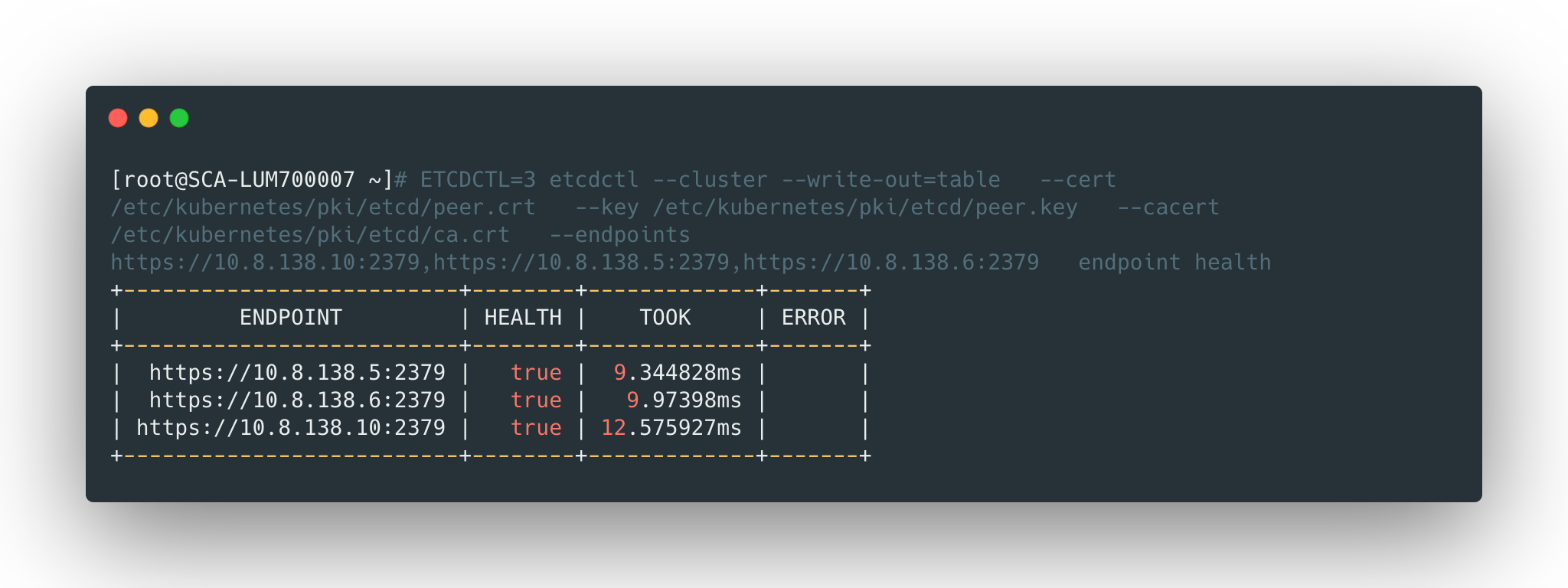 1 | ETCDCTL=3 etcdctl --cluster --write-out=table --cert /etc/kubernetes/pki/etcd/peer.crt --key /etc/kubernetes/pki/etcd/peer.key --cacert /etc/kubernetes/pki/etcd/ca.crt --endpoints https://10.8.138.10:2379,https://10.8.138.5:2379,https://10.8.138.6:2379 endpoint health |