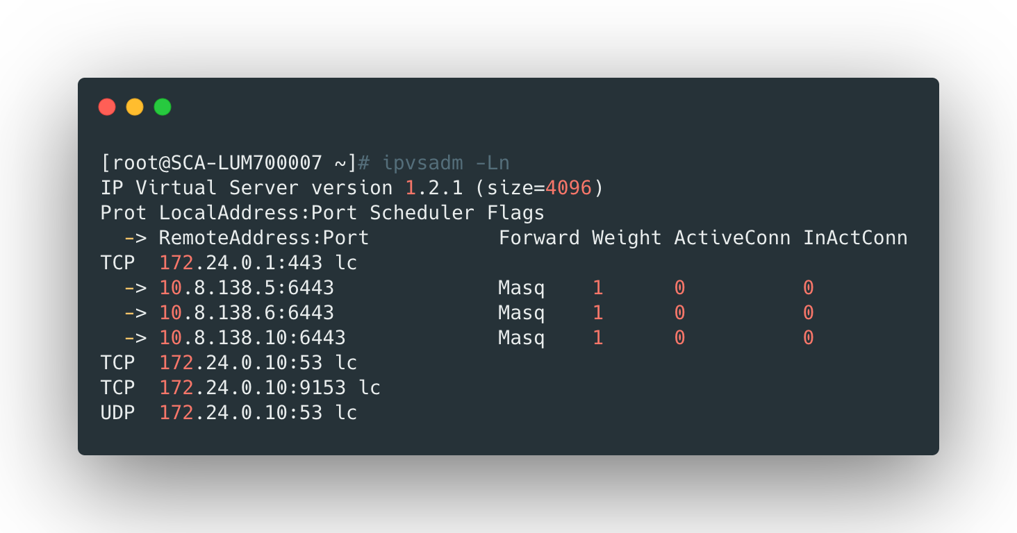 操作系统centos7.6,前端还有一个elb,地址为10.8.138.12,代理master的apiserver。kube-proxy使用ipvs模式,集群使用1.17.3版本