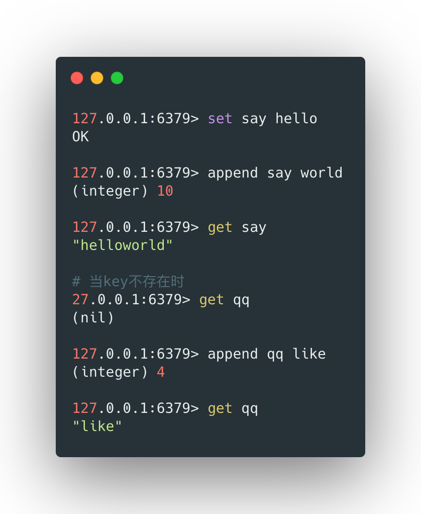 append命令可以在指定key的value后面追加字符串。如果key不存在,则会创建这个key并将需要追加的内容作为value赋值,其格式如下: