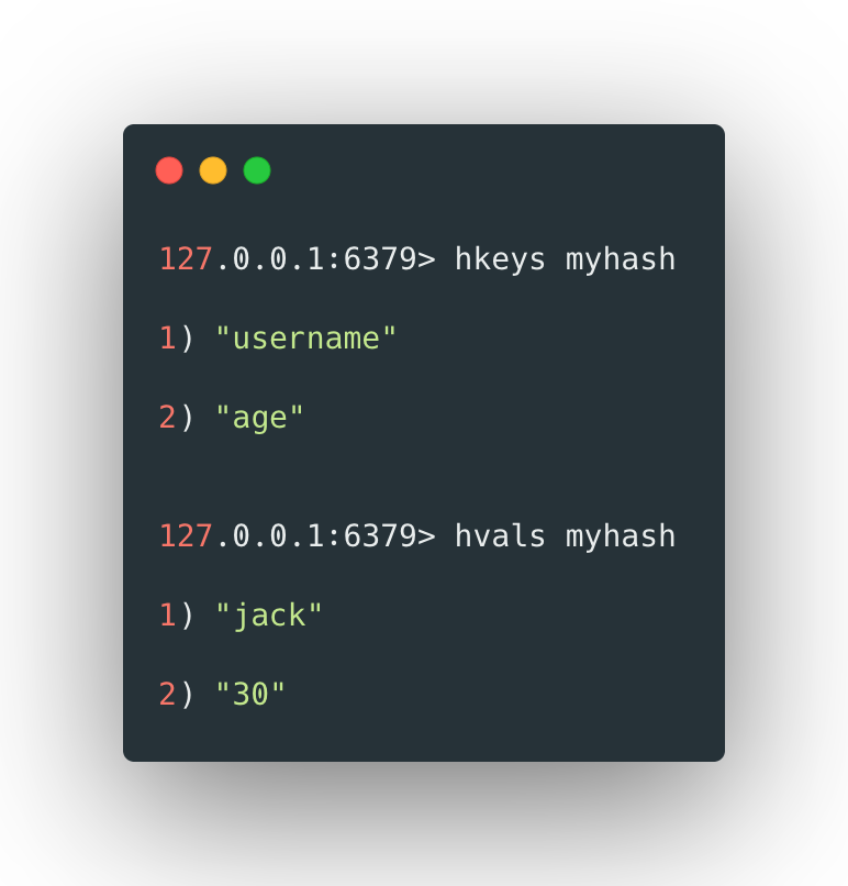hkeys和hvals分别可以获得hash中所有的keys和所有的values,其格式如下: