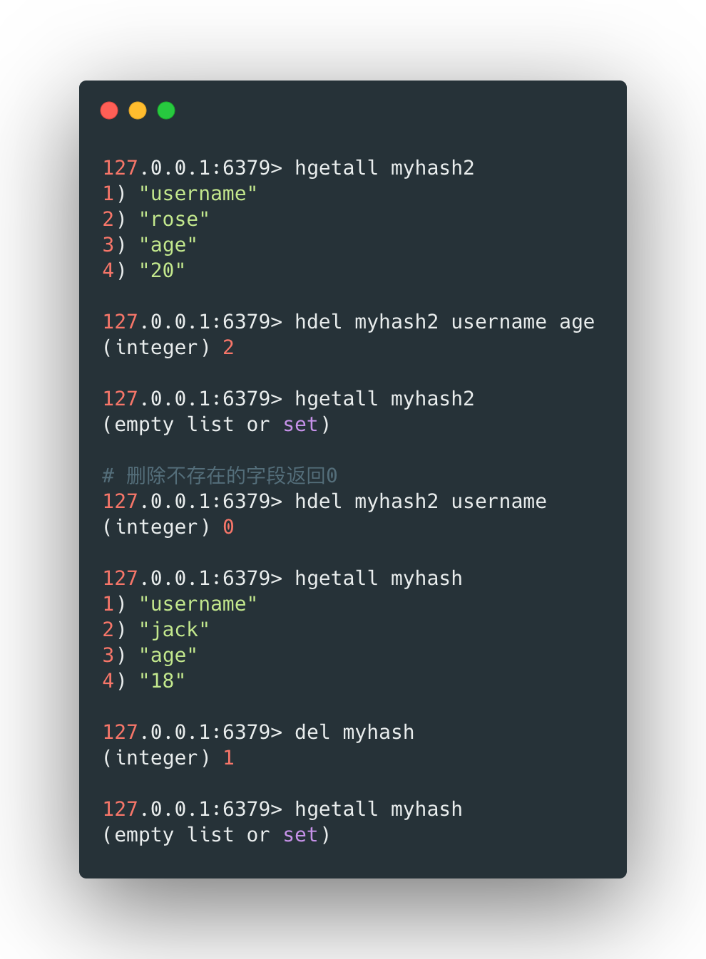 hdel和del可以删除hash类型数据中属性以及其值,格式如下: