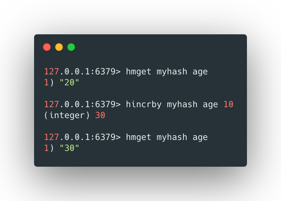 hincrby操作可以给hash类型属性的值增加指定的单位,其格式如下: