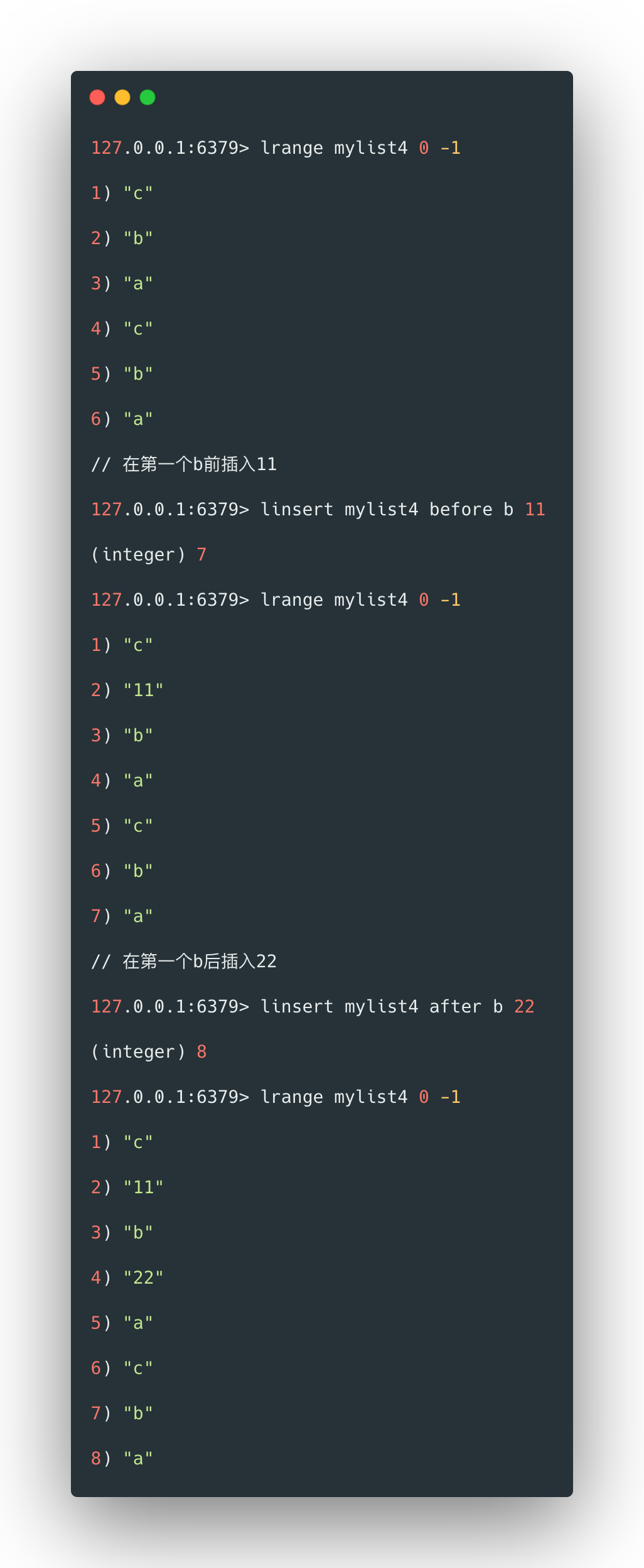 1 | linsert [key] [before|after] [已存在的元素] [value] |