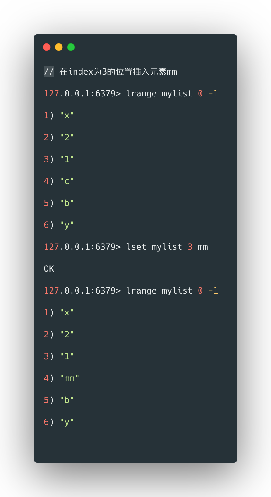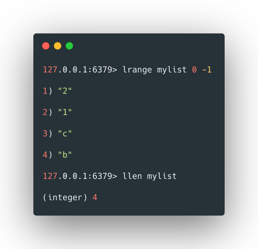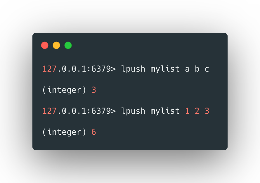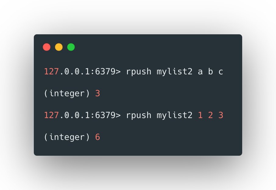 第一次添加将创建名为mylist的列表,从返回值可以看出,经过两次添加,列表长度为6。先添加的数据会被后添加的数据挤到右侧。