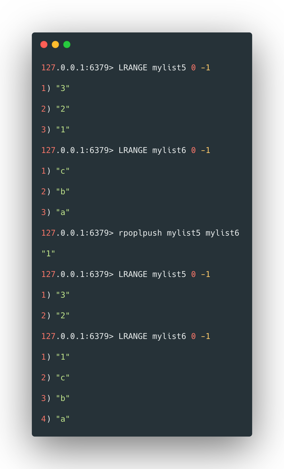 rpoplpush指令可以将一个list的尾部元素弹出,并加入另一个list的头部,其格式如下: