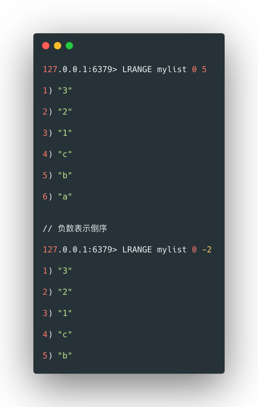 lrange可以从左侧为起点查看列表,lrange也可以指定起始和结束的索引位置,其格式如下: