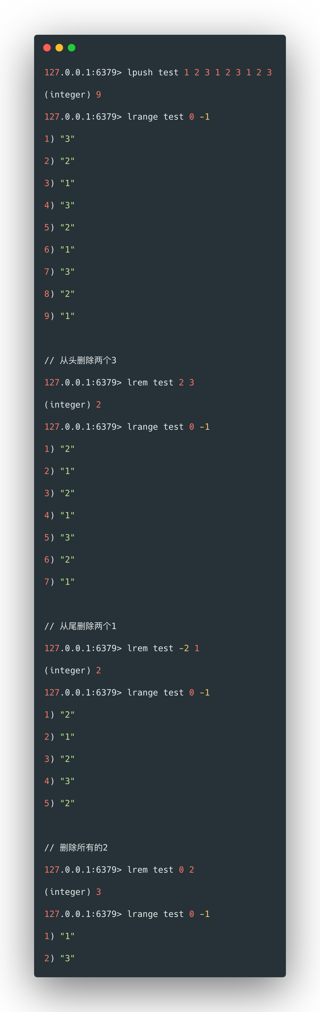 lrem可以删除在指定list中count个值为value的元素,如果count大于0则在删除时从头部到尾部依次遍历删除,如果count小于0则在删除时从尾部到头部部依次遍历删除,如果count为0则删除所有值为value的元素,其格式如下: