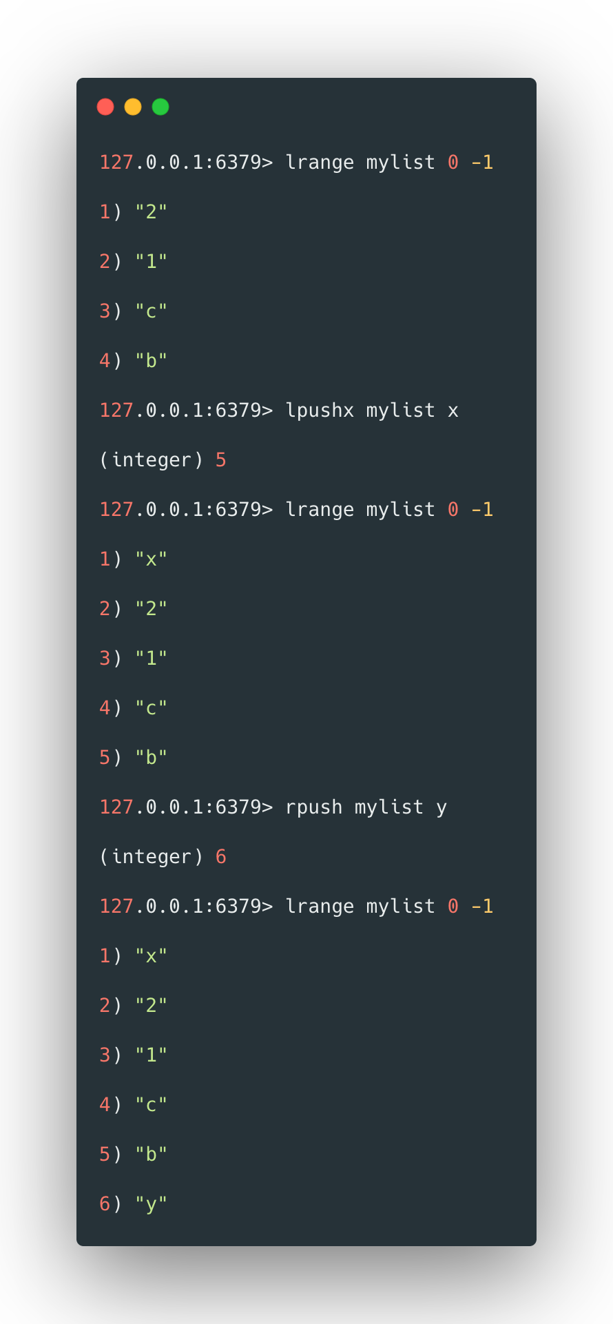lpushx和rpush可以在指定的list的头部和尾部添加元素,其格式如下: