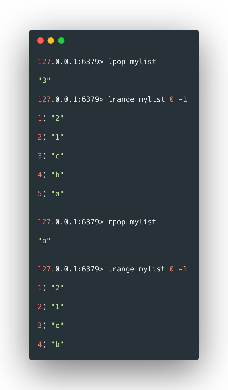 lpop和rpop可以实现左端和右端弹出列表第一个元素,如果不存在则弹出nil,其格式如下: