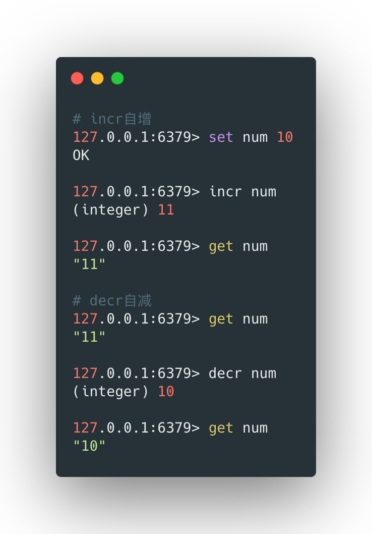 incr和decr命令可以分别让key对应的value自增1和自减1: