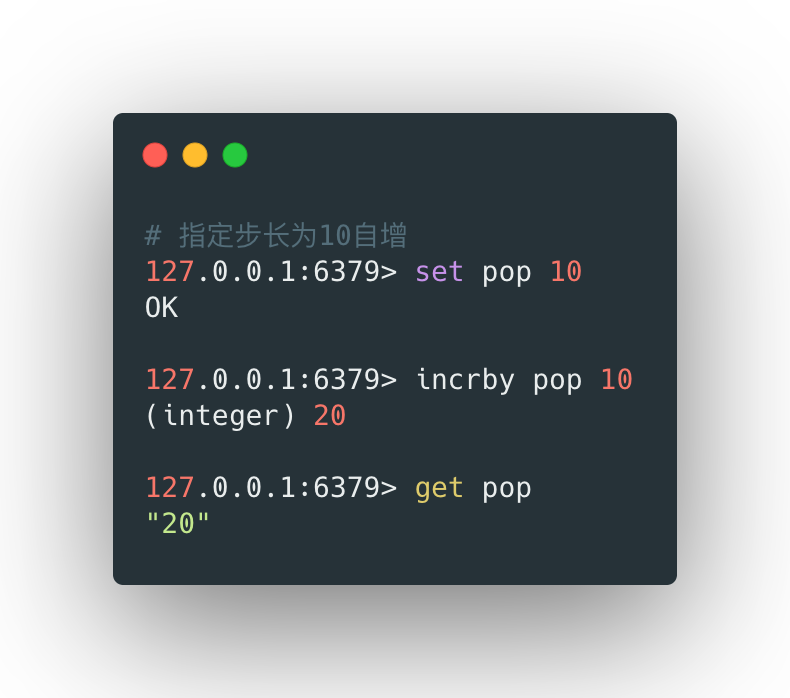 默认incr和decr的步长都是1,但是incrby和decrby可以指定自增和自减的步长单位,其用法和incr与decr一致,格式如下: